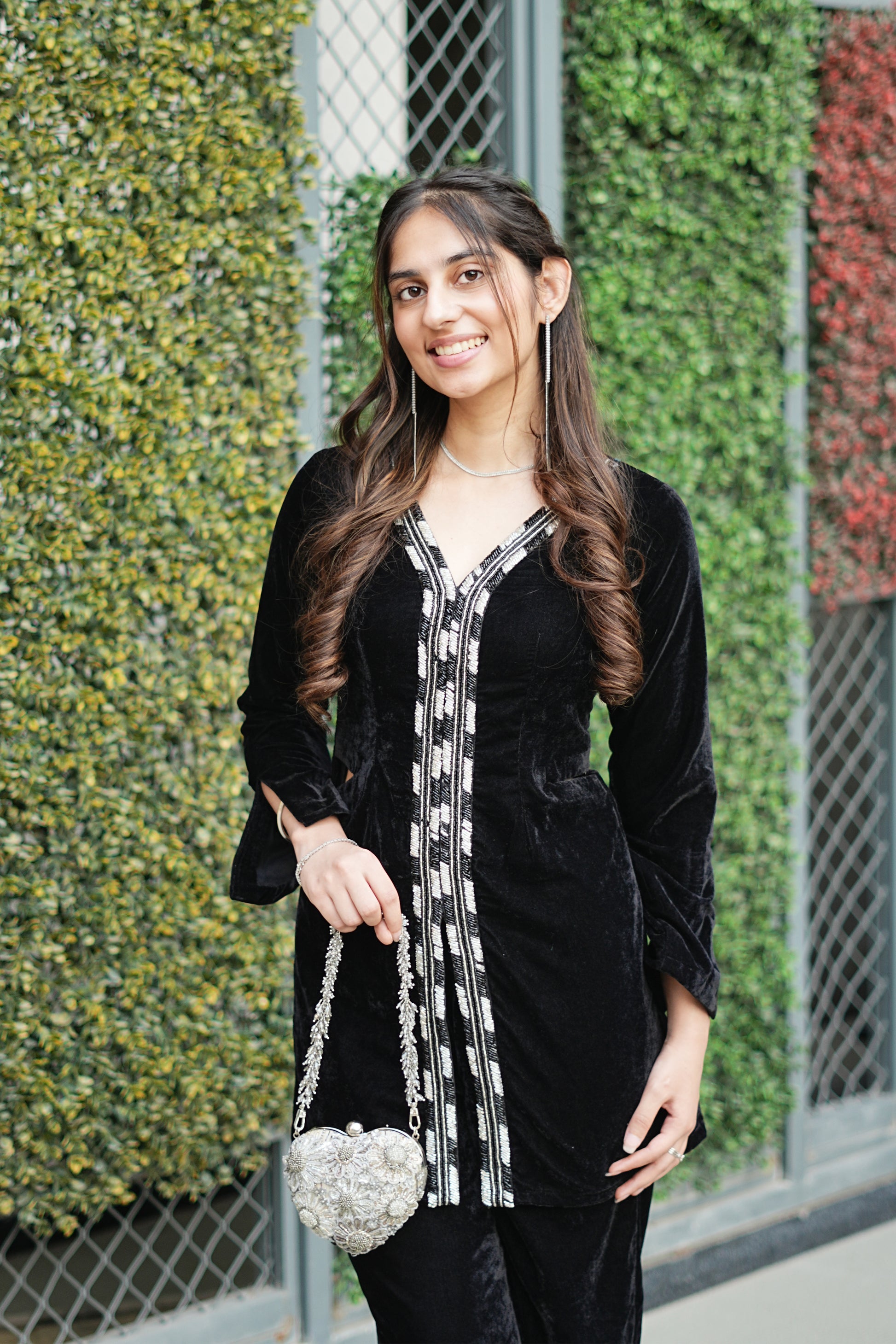 - The soft velvet shirt has a beautifully detailed black and silver bead work panel running along the neckline and center front, adding a touch of shimmer without overpowering the look. It also includes small side cuts at the waist for added ease and shape. The sleeves come with elegant slit detailing that enhances the outfit’s contemporary appeal.