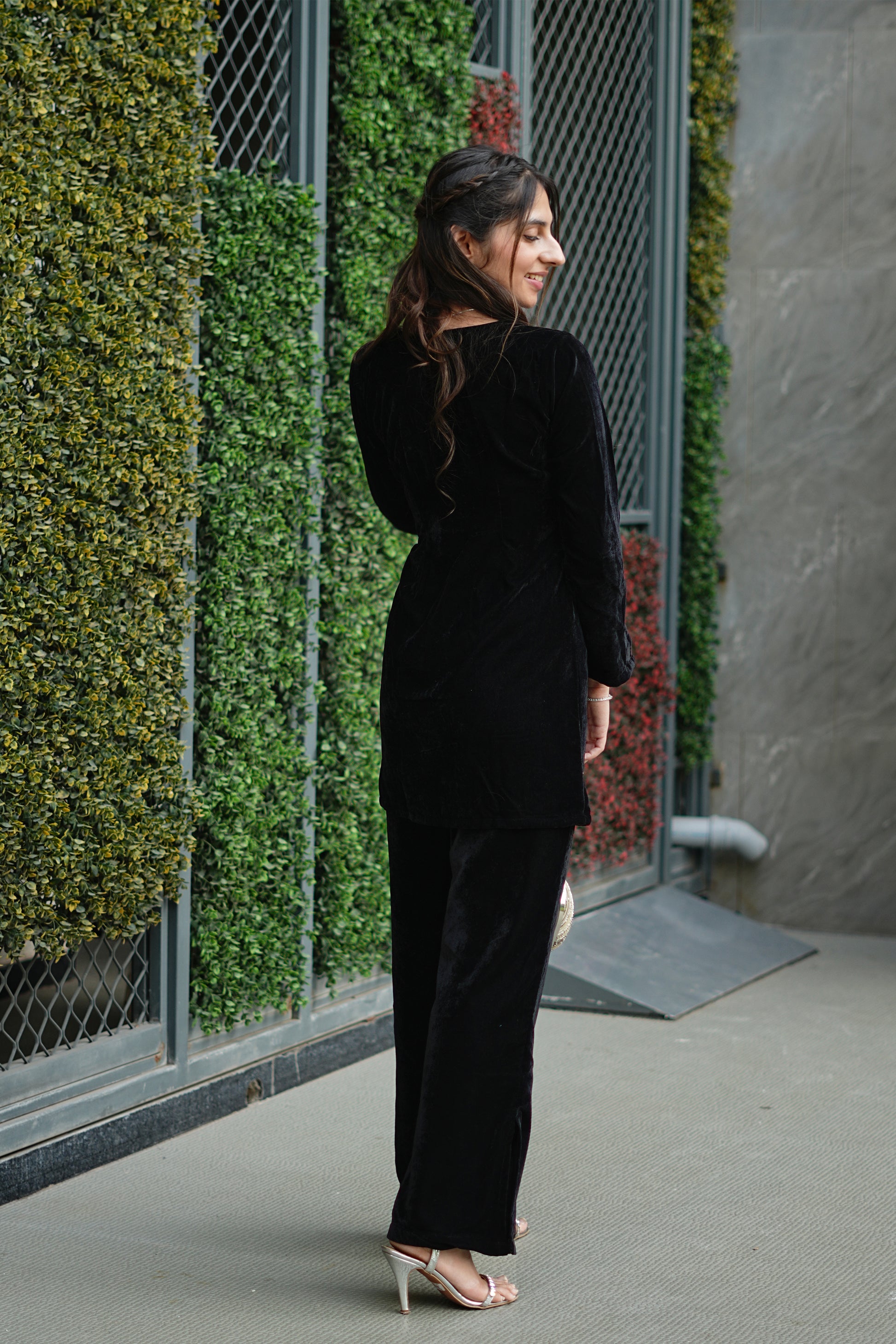 - Paired with matching black velvet straight pants with minimal side slits, the outfit maintains a sleek and polished look that’s both comfortable and flattering.