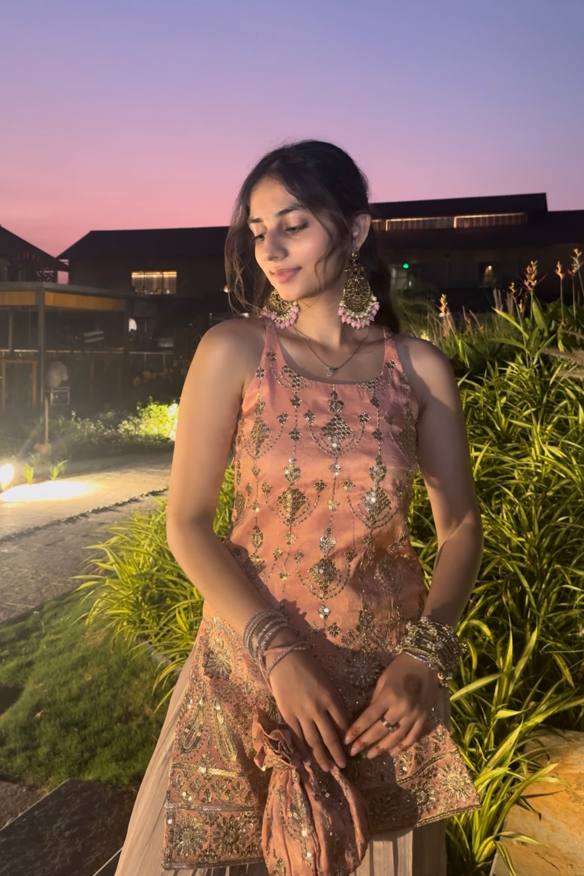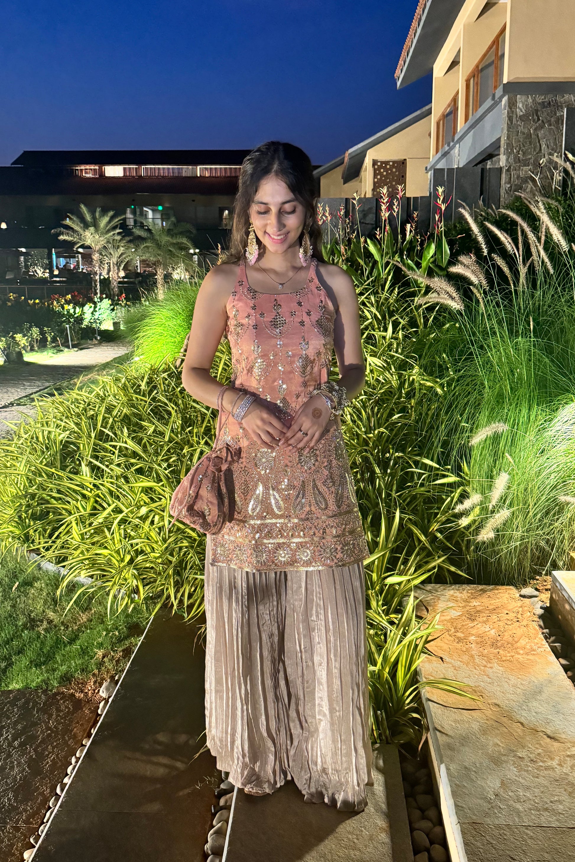 - Completing the set is a beautiful pleated sharara adding a festive charm.
