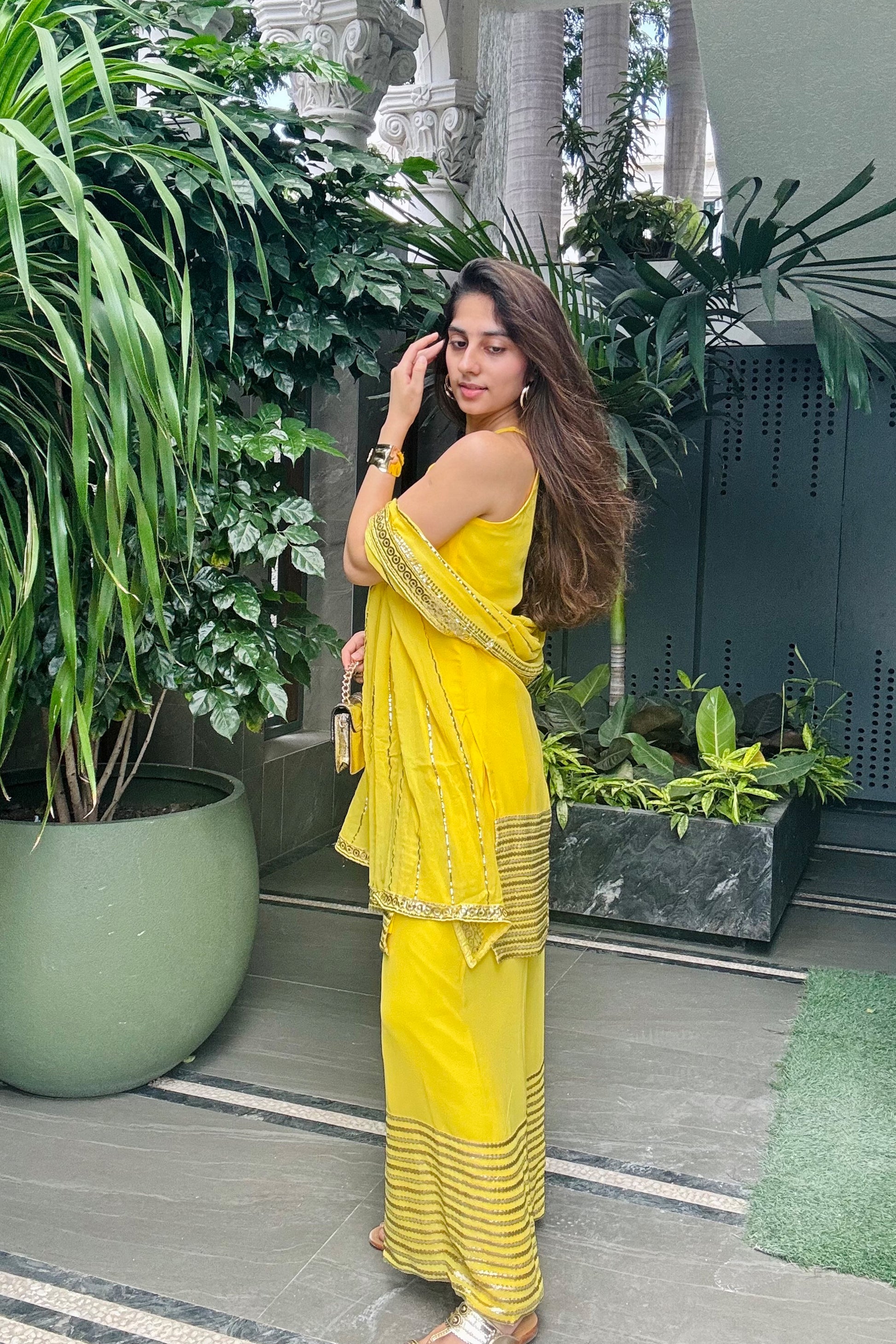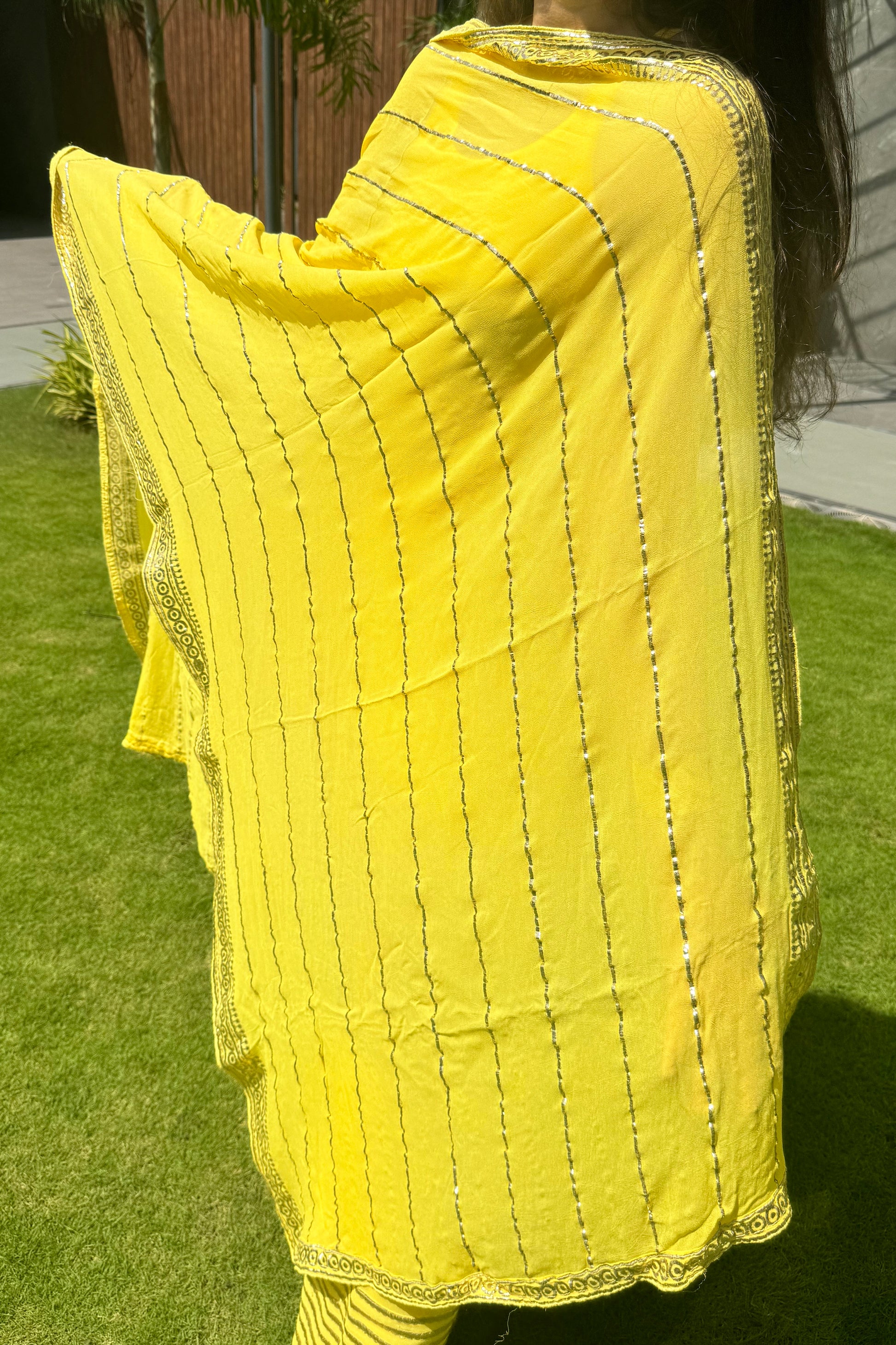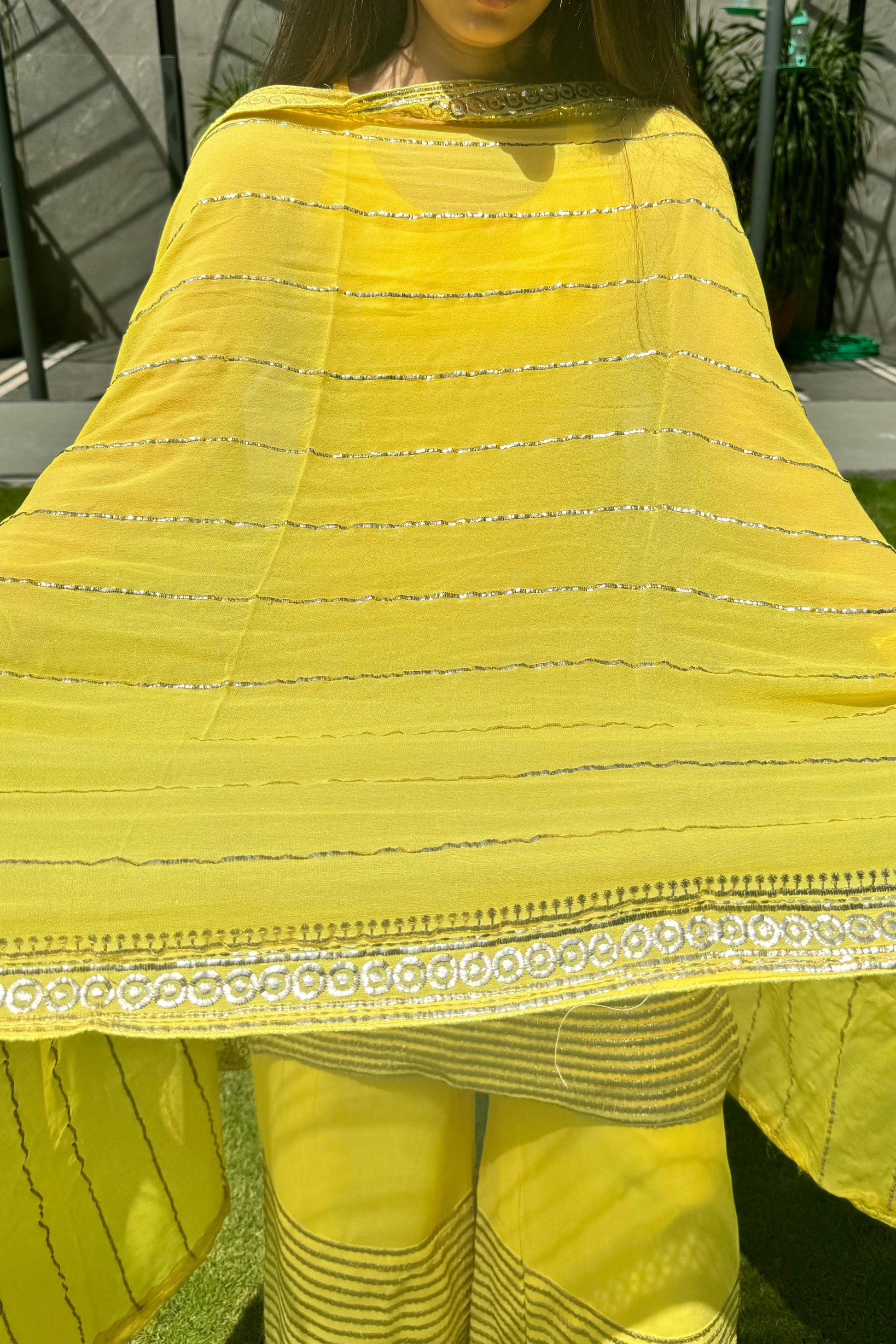 - Dupatta is also highlighted with all-over foil work lines and a four-sided embellished border, it ties the look together with its soft sheen and traditional charm.