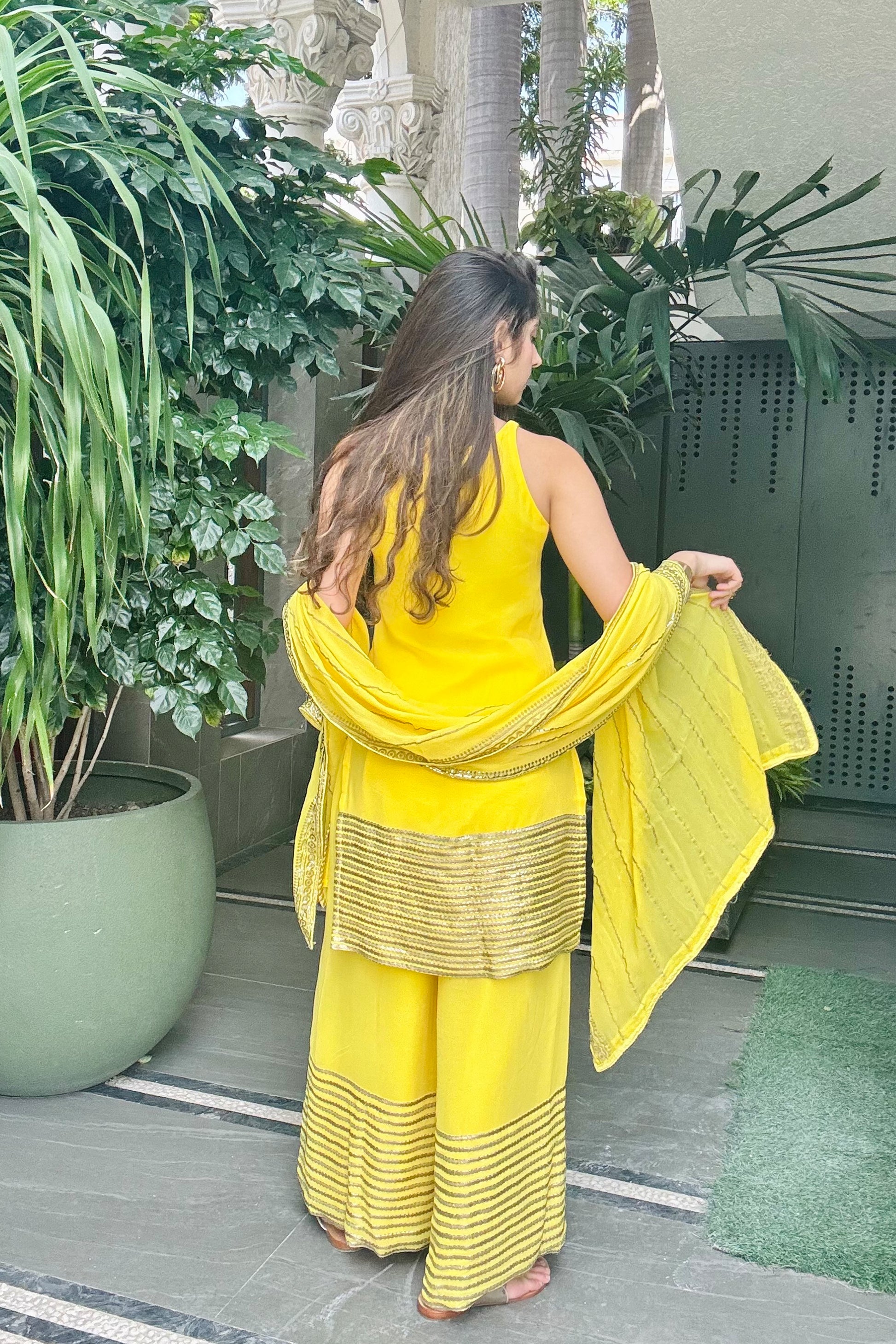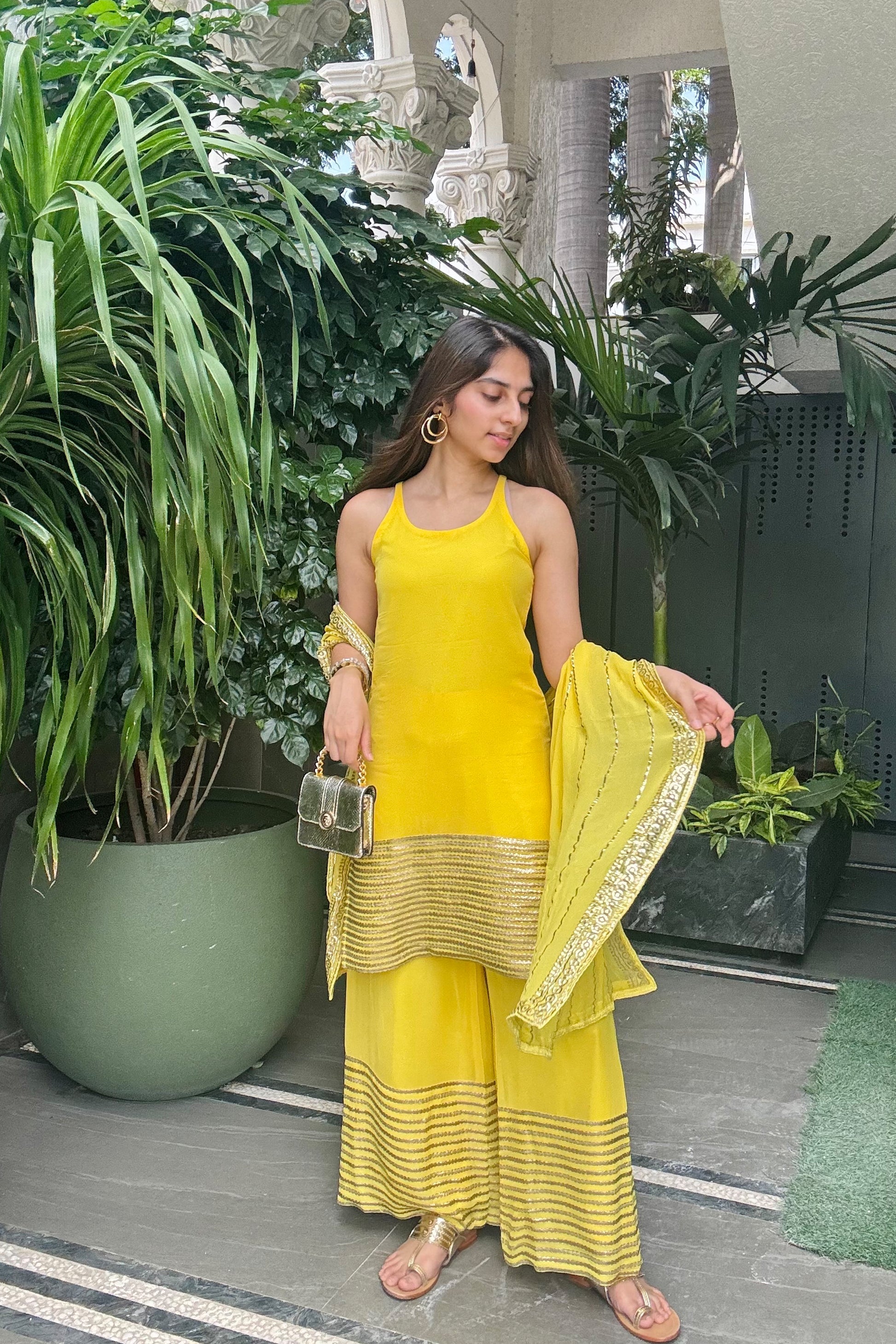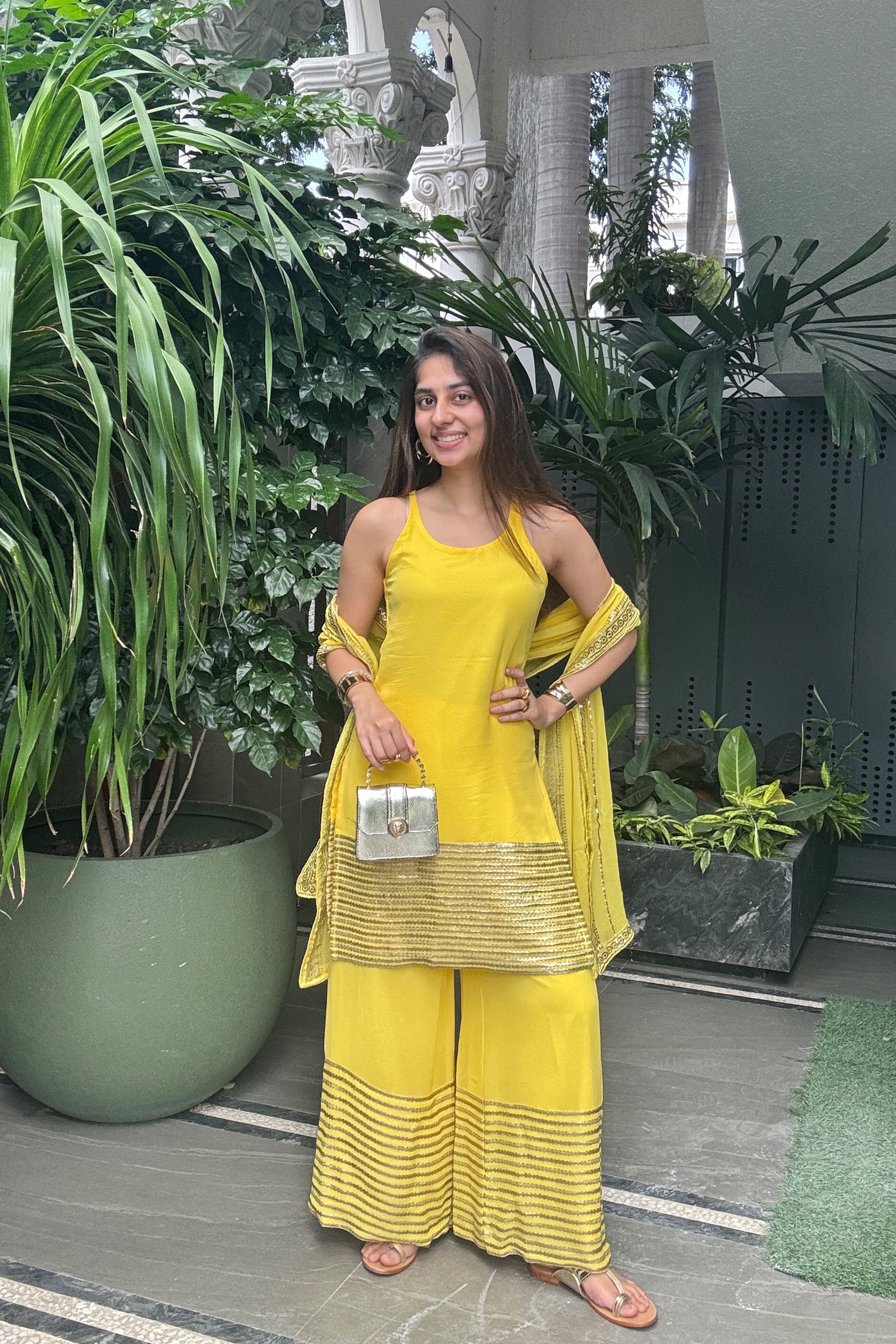 - Dupatta is also highlighted with all-over foil work lines and a four-sided embellished border, it ties the look together with its soft sheen and traditional charm.