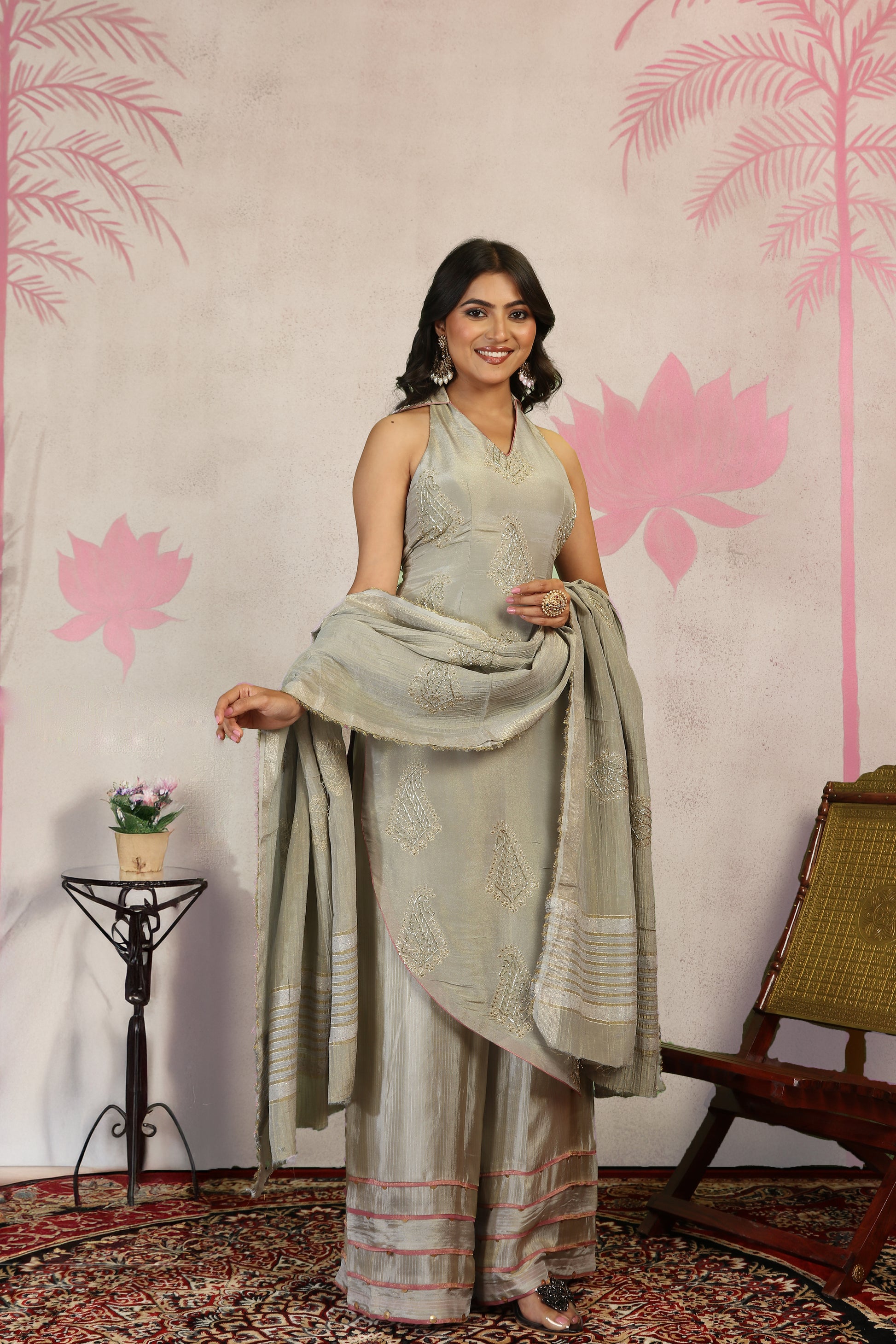 - Tissue suit with halter neckline and collar with an asymmetrical silhouette with all-over paisley motifs in heating sequins, finished with a hint of purple piping for contrast.