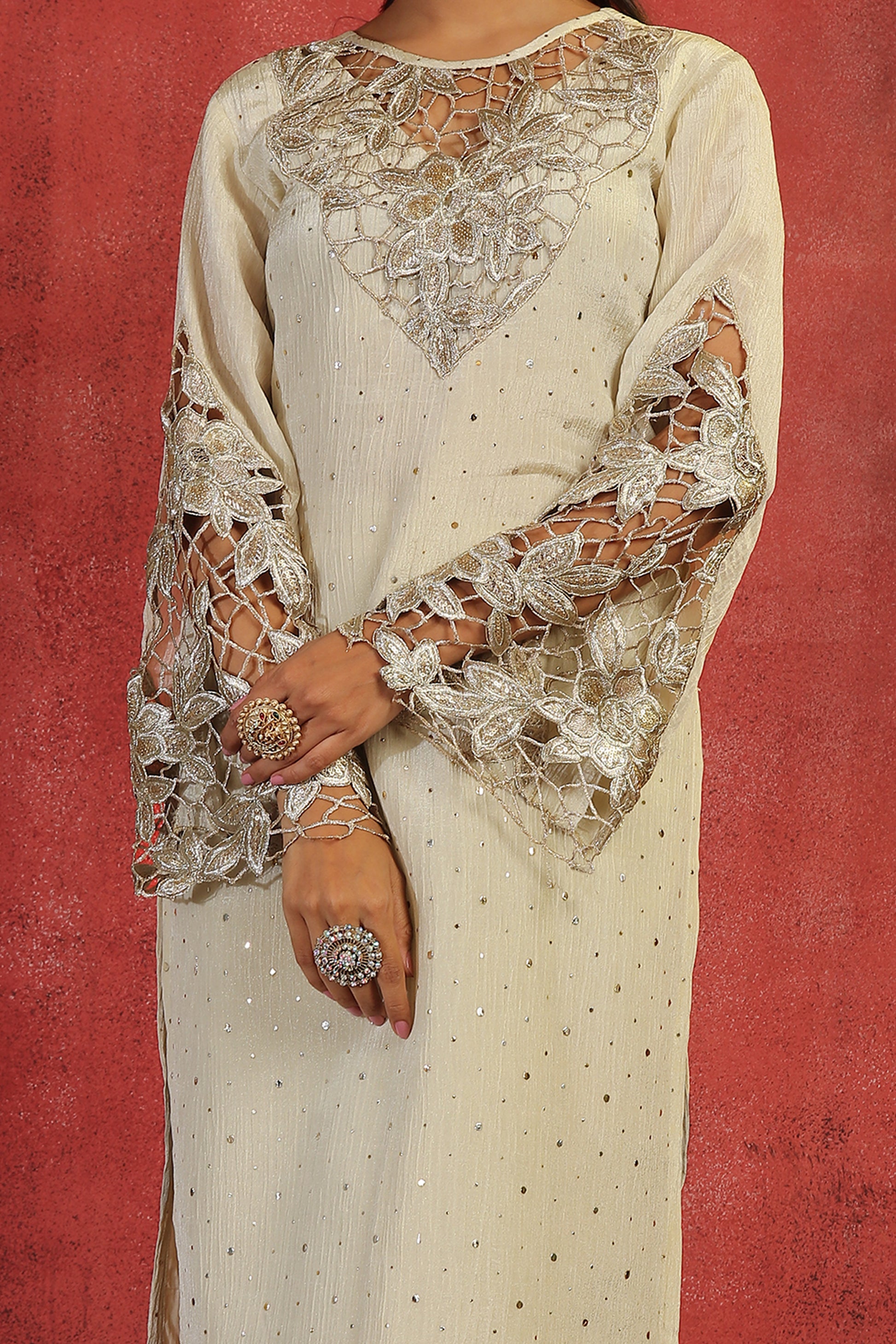 - Straight-fit tissue co-ord set featuring allover pitha work. The neckline is finished with cutwork, while the bell sleeves also have cutwork detailing with pitha highlights.