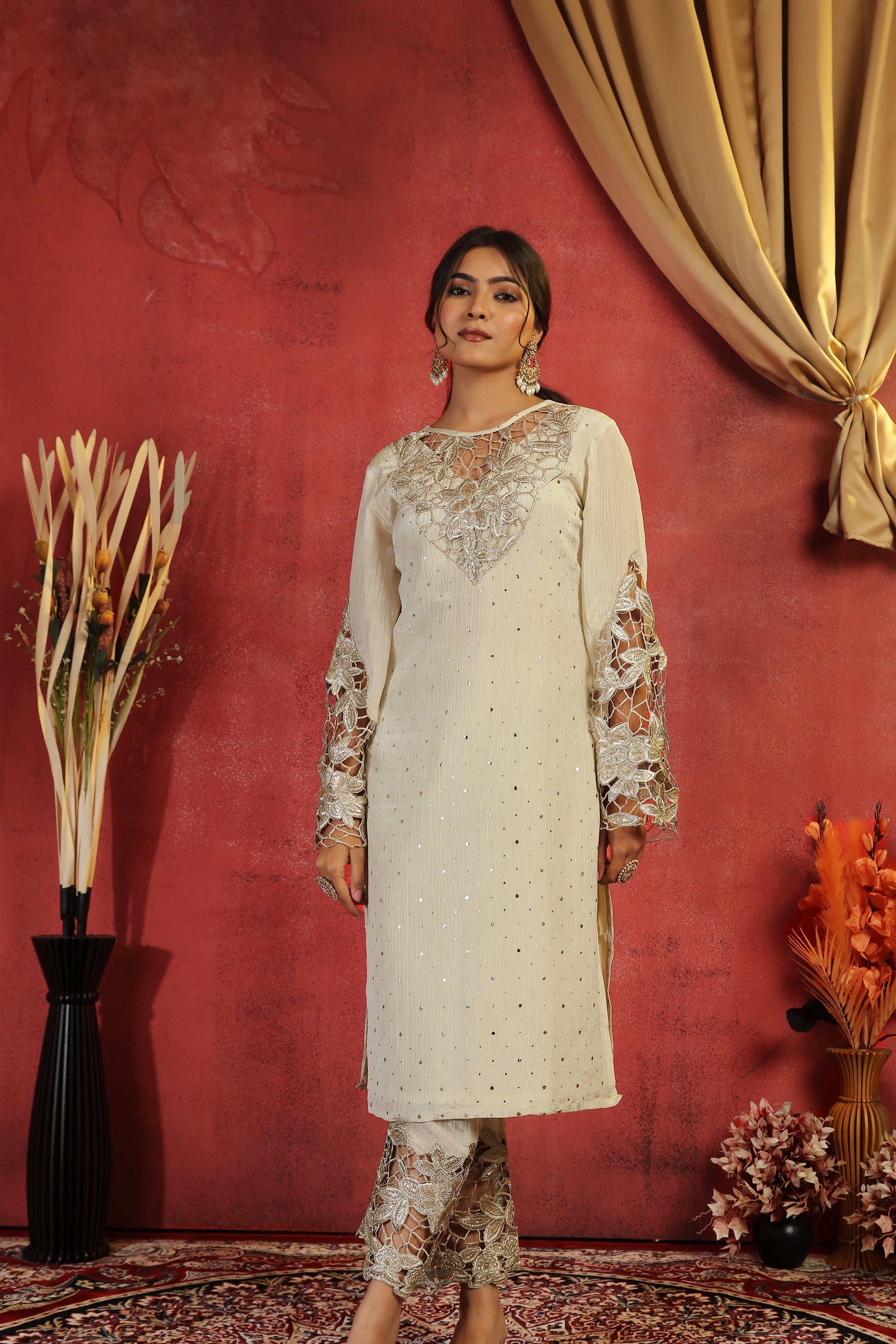 - Paired with straight pants designed with a cutwork border, making it a balanced and elegant ensemble for festive wear.