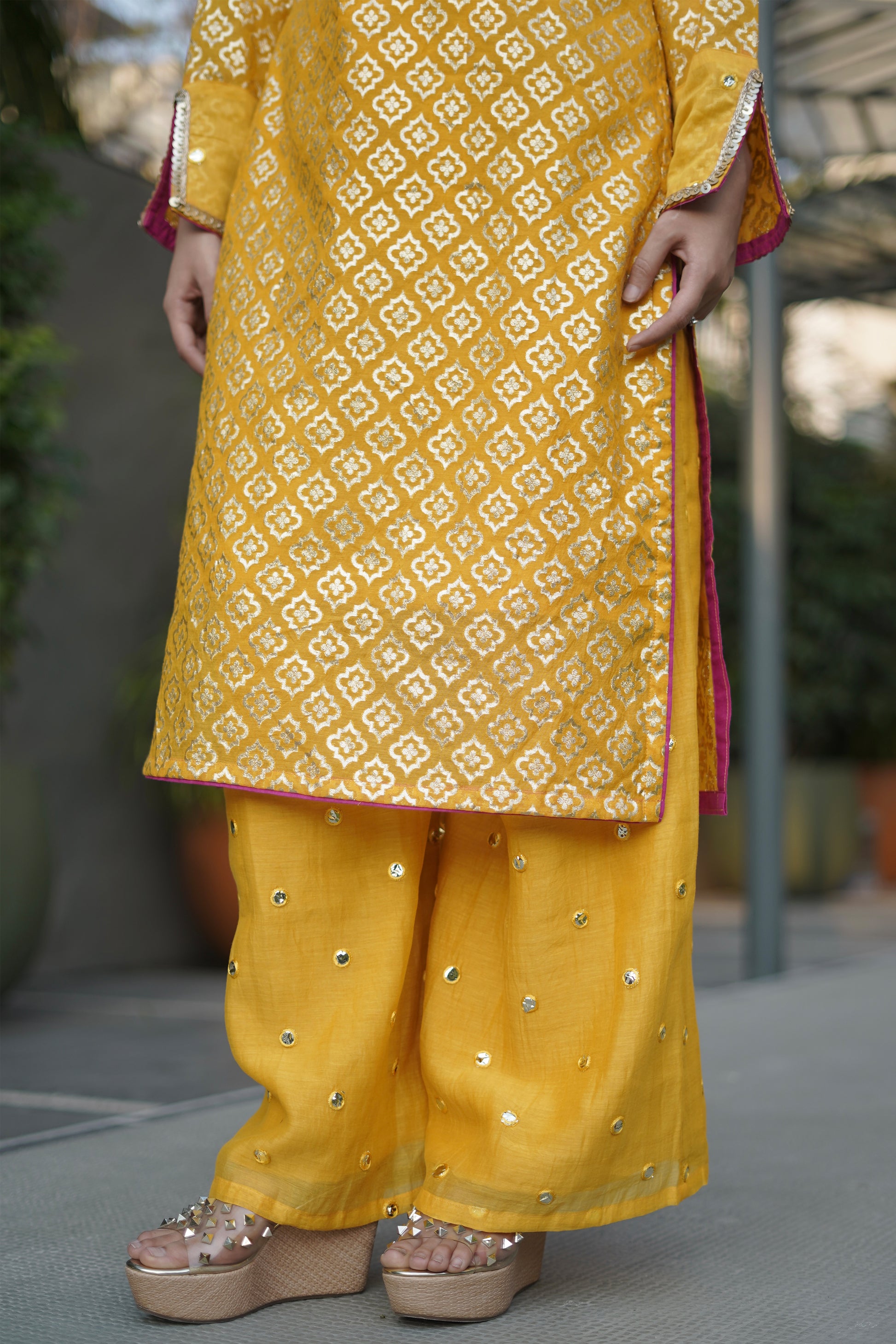 - The kurti has a geometric woven pattern in Chanderi fabric and intricate multicoloured hand-worked beaded and mirror work at the neckline. The sleeves have a little centre slit and pink contrast piping is added to the suit to add a pop of colour.