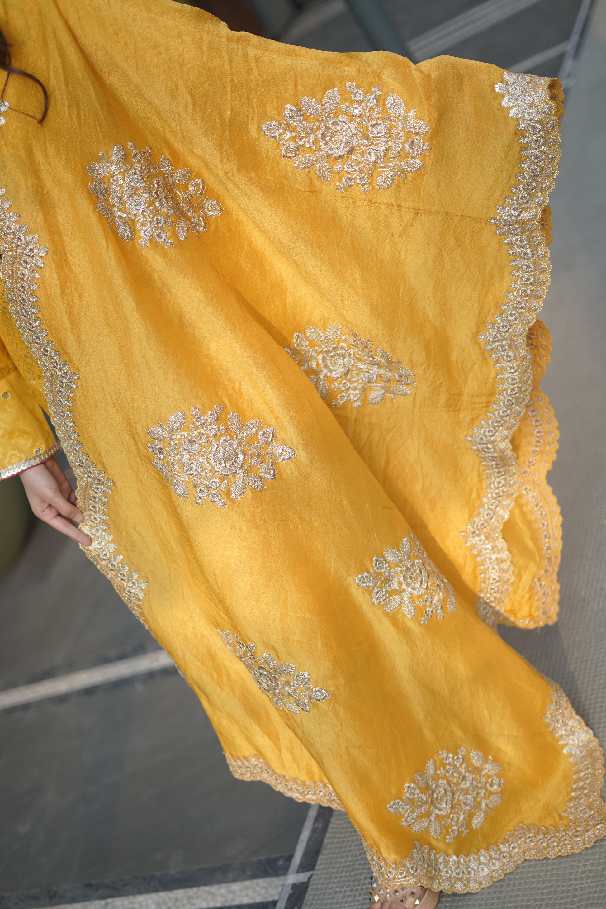 - The dupatta is detailed with embroidered motifs and finished with elegant four-sided embroidered pattern, adding a festive charm to the look.