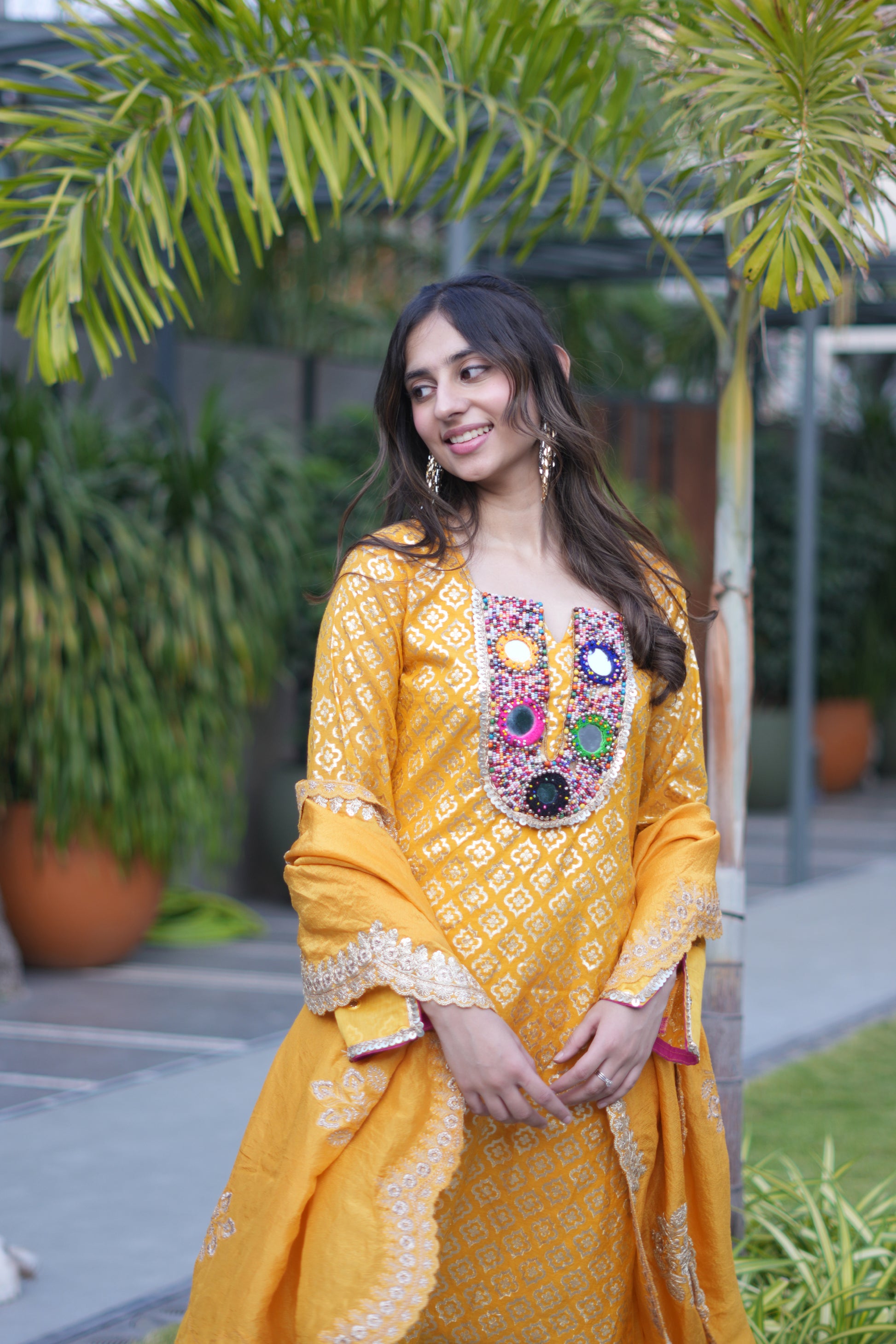 Mustard Chanderi Beadwork Suit with Tissue Dupatta
