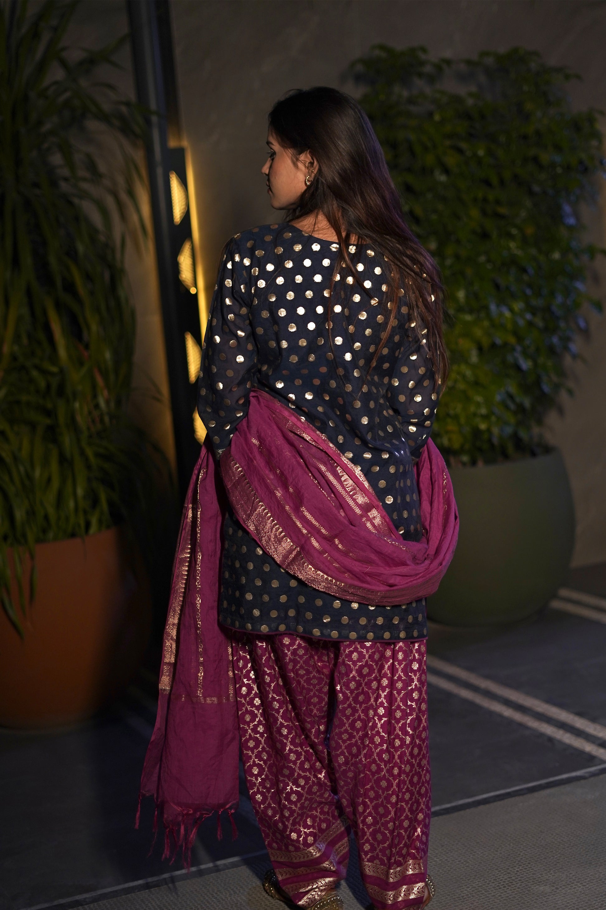 - The set is paired with a magenta Patiala-style salwar, designed in tones that matches the kurti.