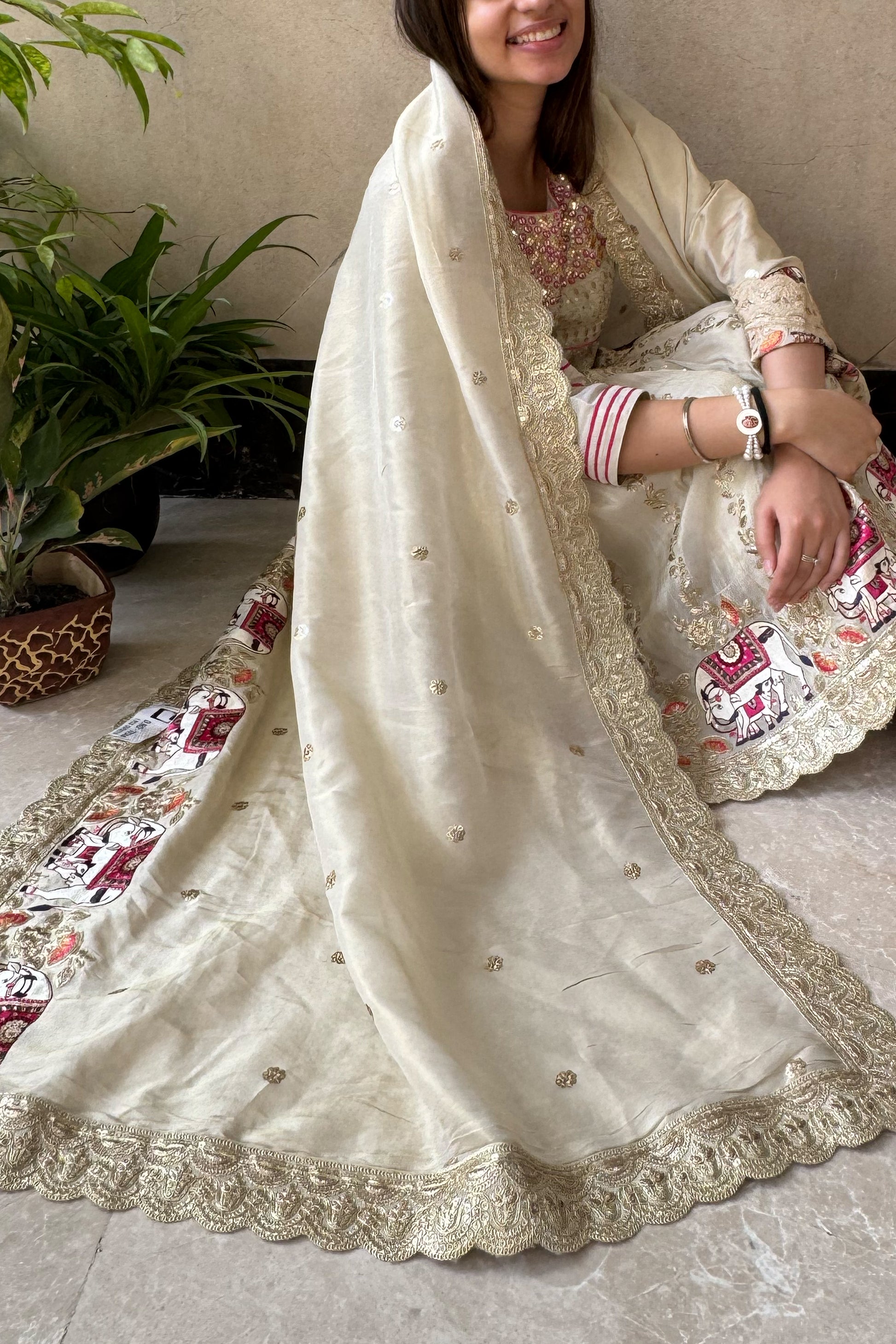 - The look is completed with full-size dupatta with matching cord motifs allover and four-side pichwai border.