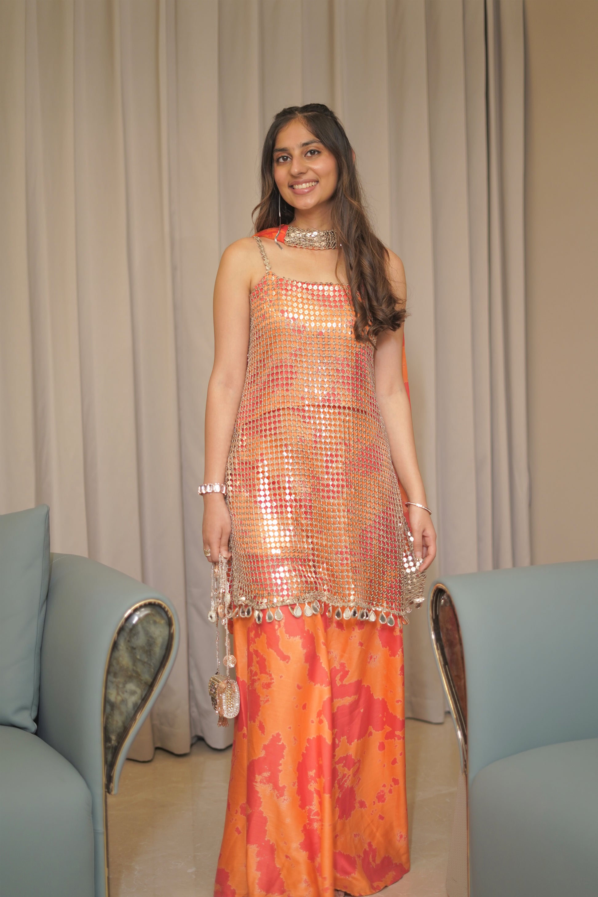 - The highlight of this outfit is the intricately made sequin cutwork overlay kurti, which has an all-over lattice pattern. It is finished with delicate mirror detailing at the hem.