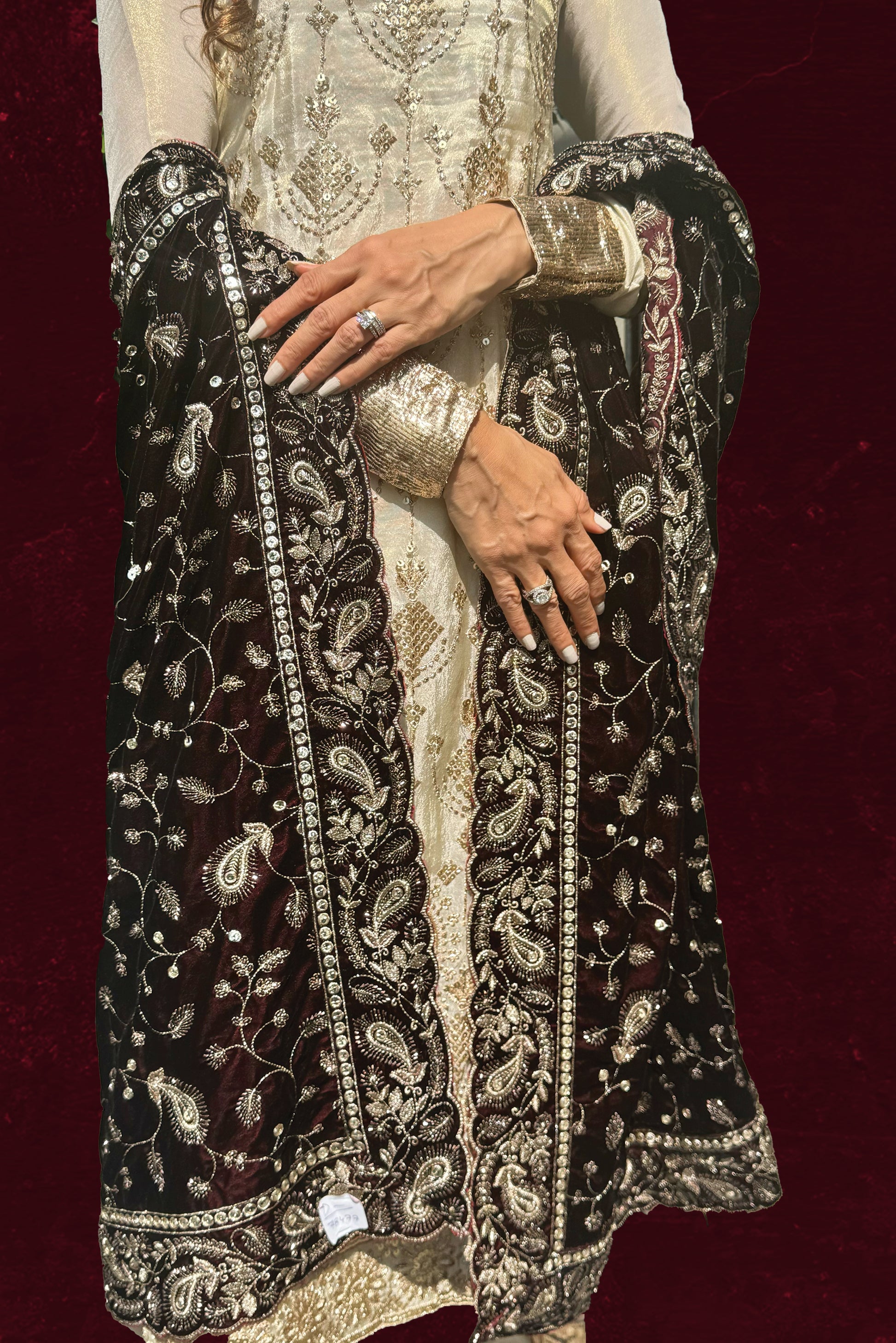 - The look is completed with a contrast velvet dupatta, designed with a four-sided border and scattered zari and sequin paisley motifs all over, adding a regal charm and making it a must-have for festive and formal occasions.