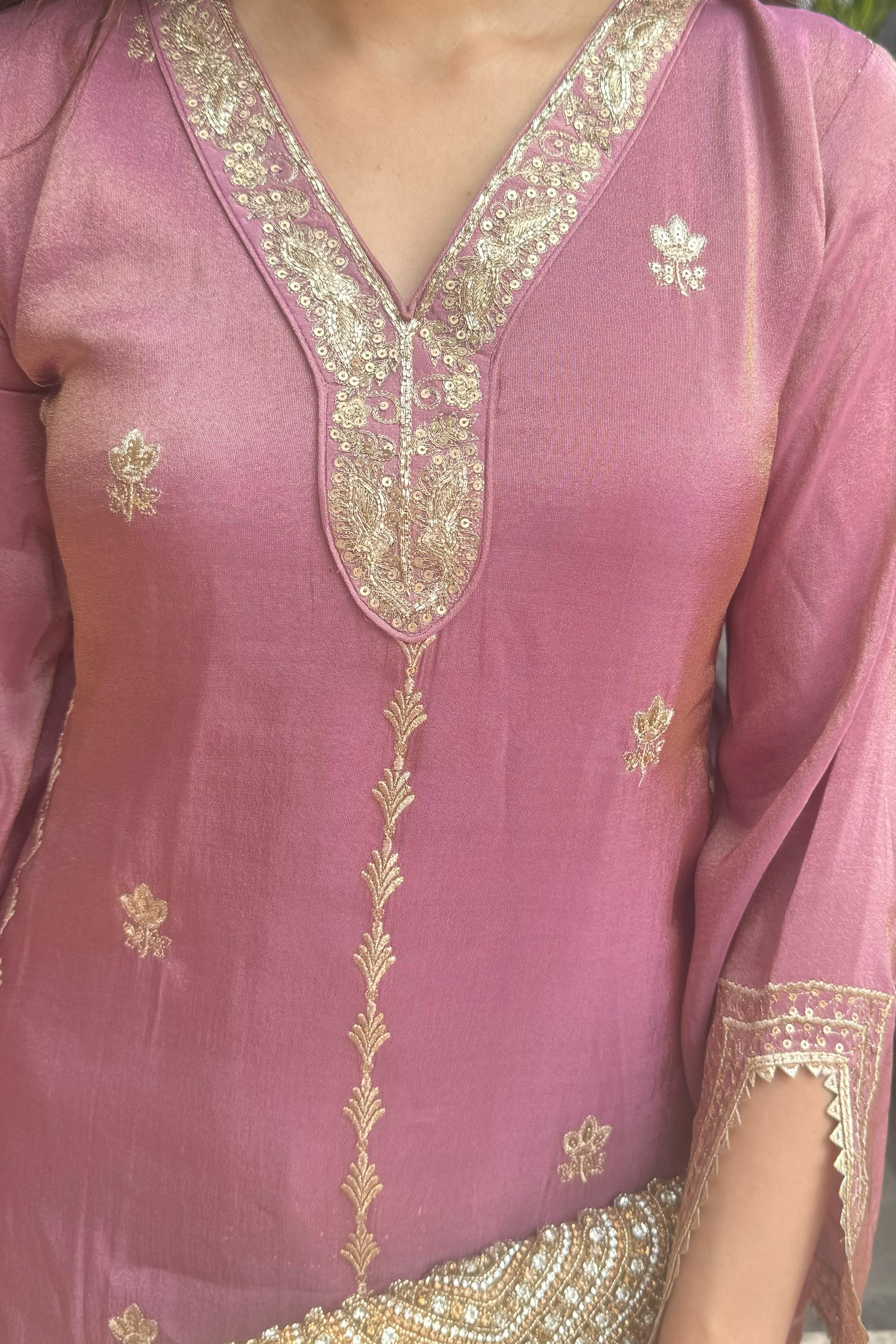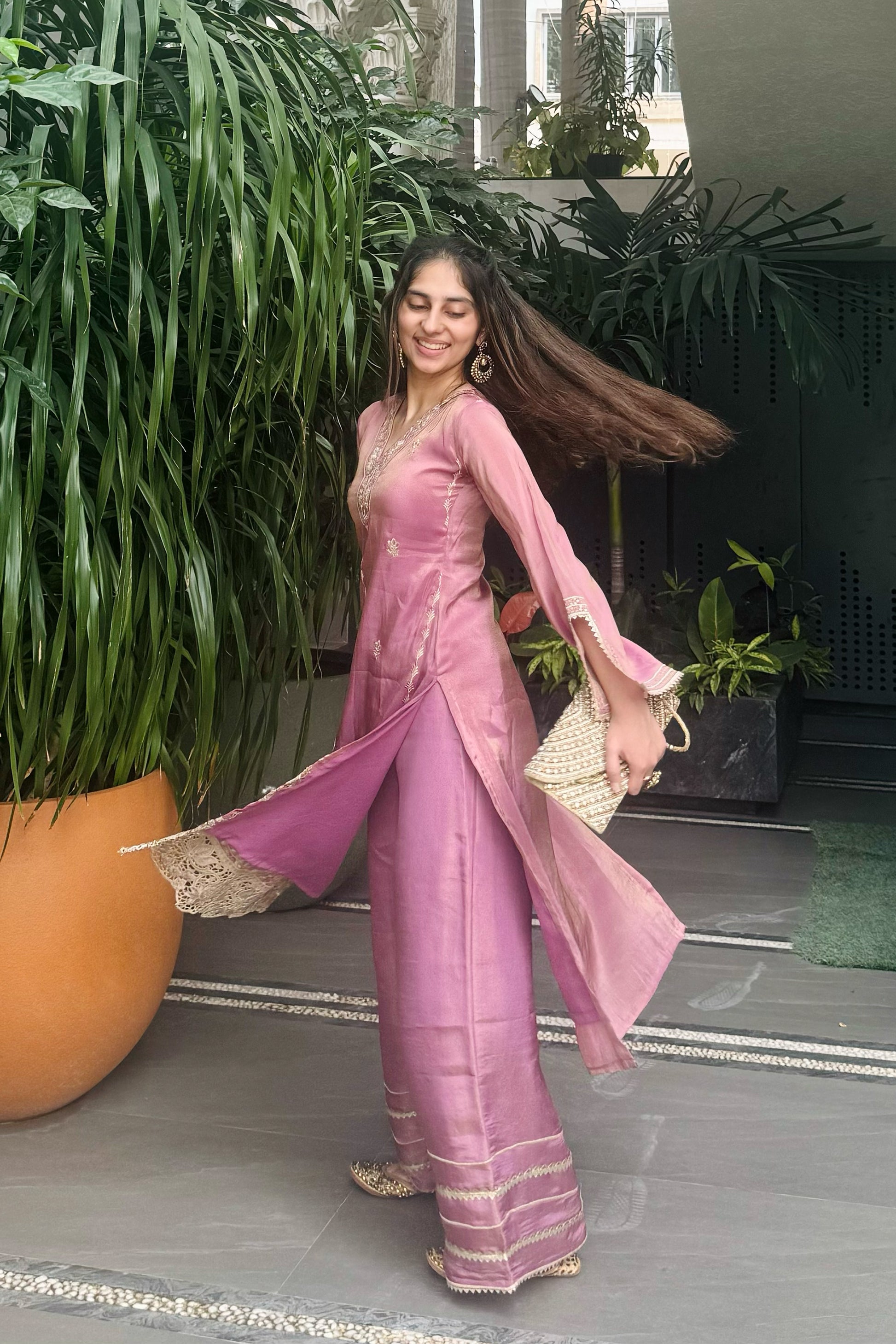 - This Mauve Pink Tissue 2-piece set is perfect for festive gatherings and special occasions.
