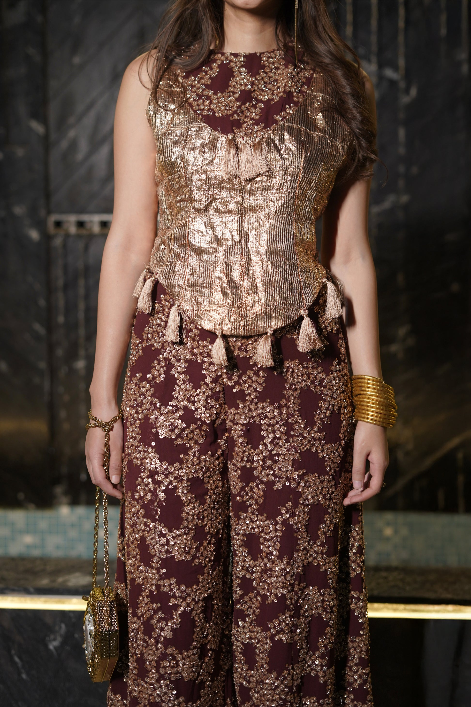 Wine Embellished Set with Metallic Top & Palazzo Pants